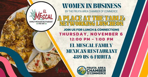 Join us for our monthly Women in Business Luncheon: A Place at the Table. This month we will meet at El Mescal Family Mexican Restaurant in Fruita. El Mescal is a casual restaurant serving classic Mexican dishes. Come for the food and stay for the connections!